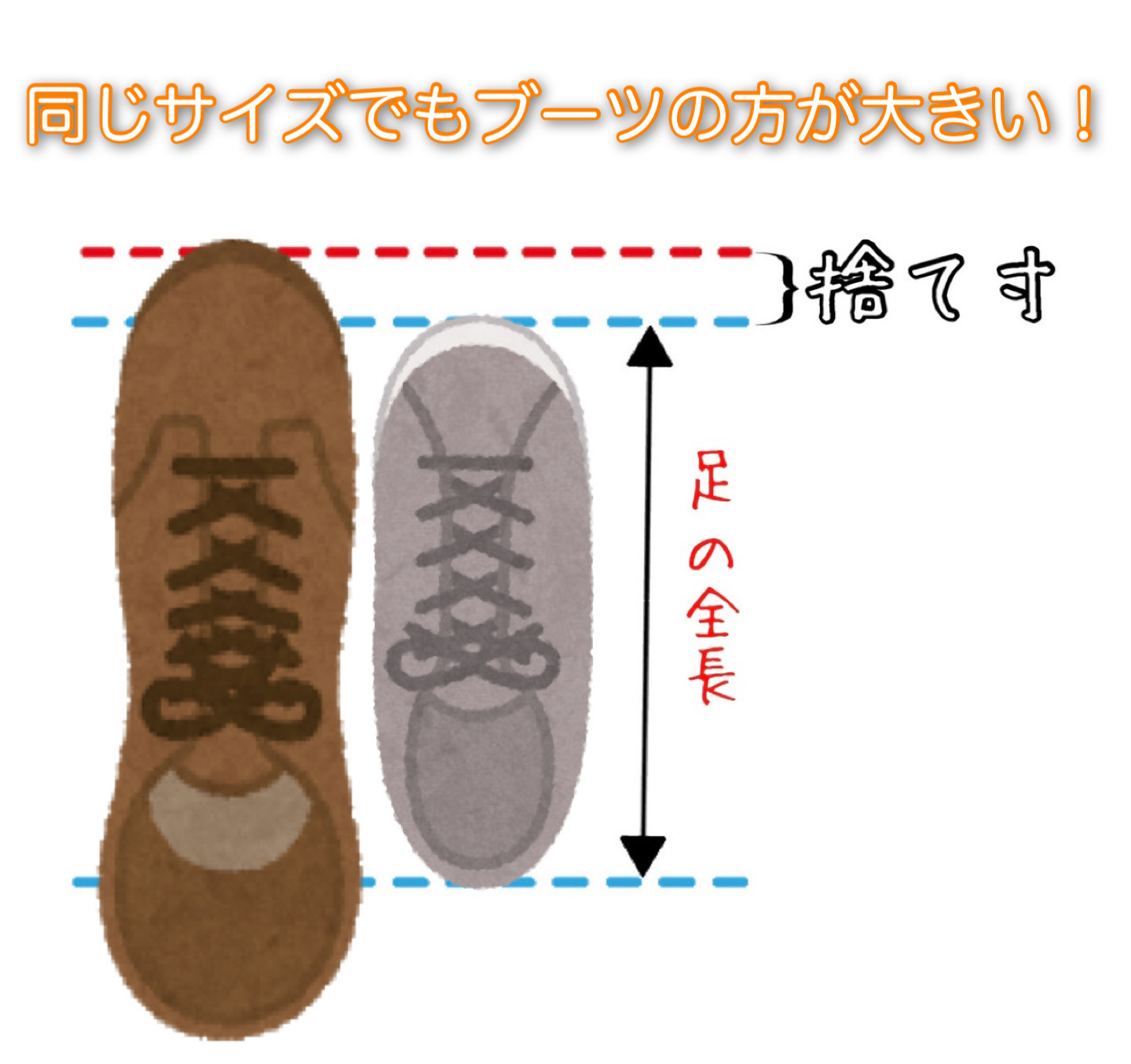たとえ、同じサイズ表記のものを選んだとしても、実際には、捨て寸の分だけ、ブーツの方が大きいサイズとなってしまいます。